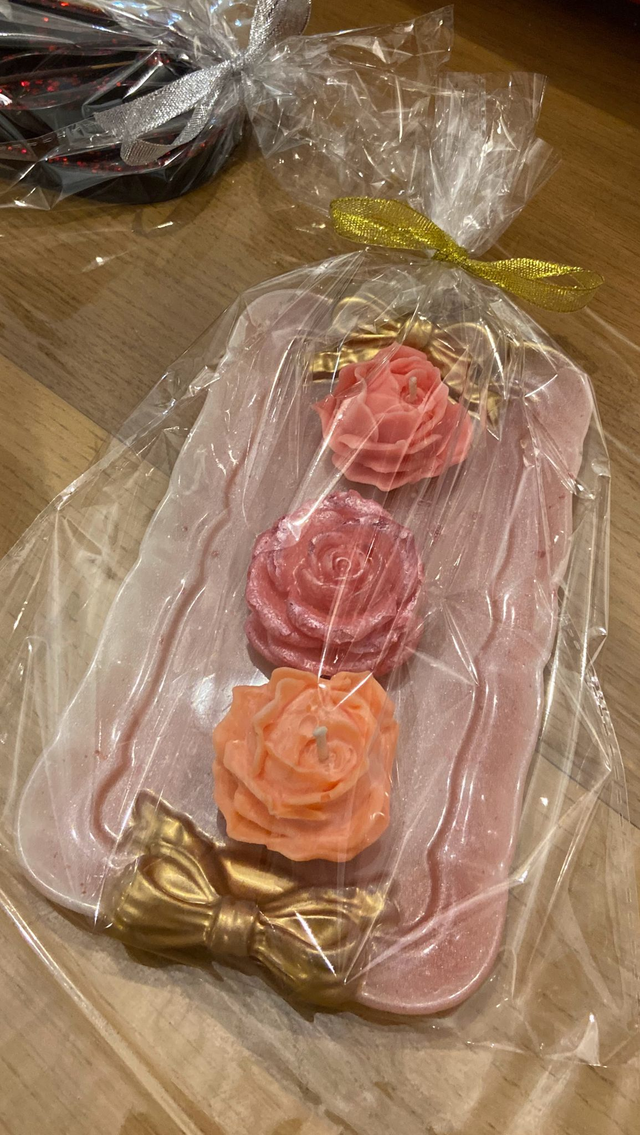 Ensemble décoratif rose : plateau en résine, deux bougies fleurs et savon parfumé à la rose – création artisanale